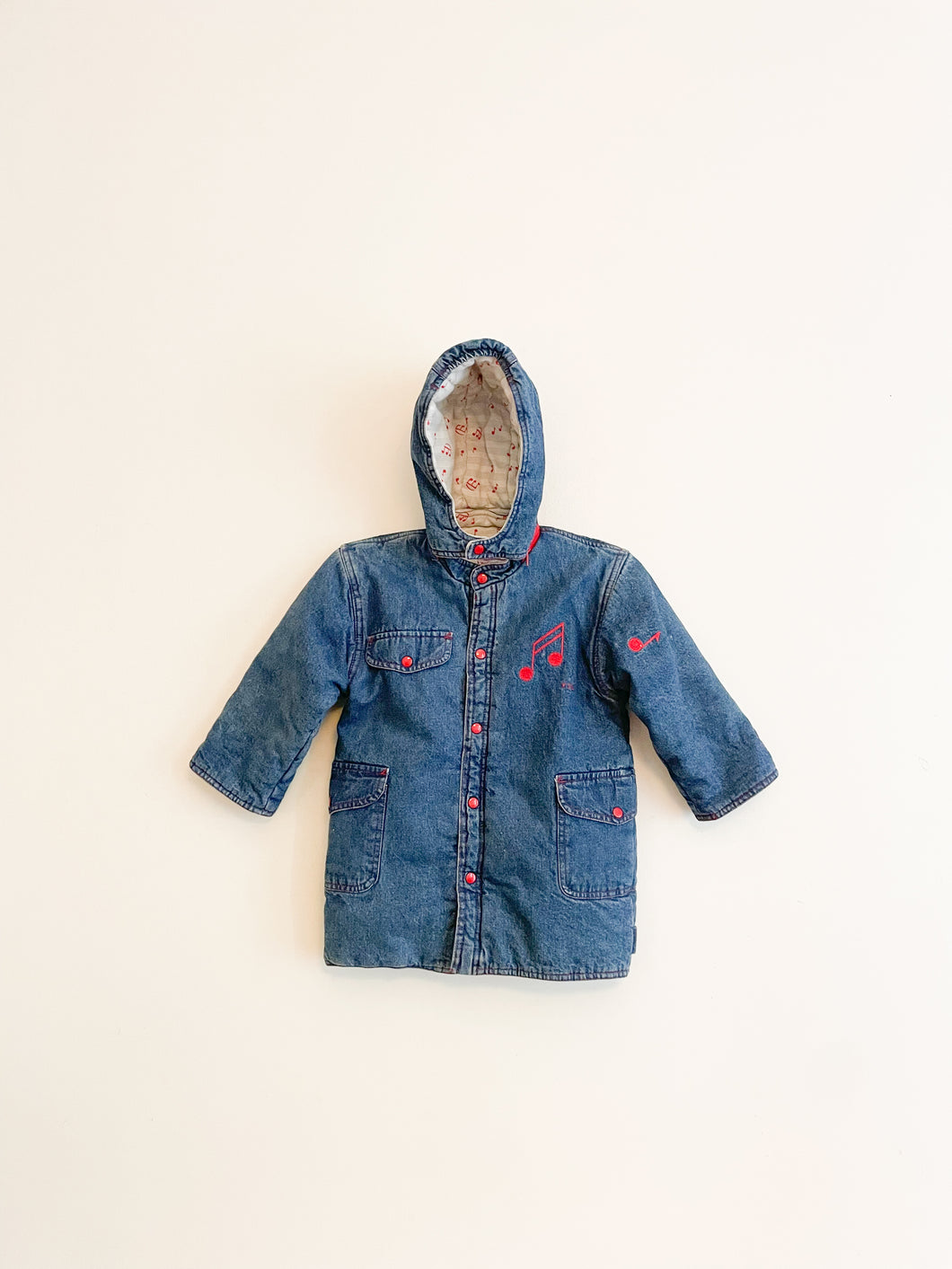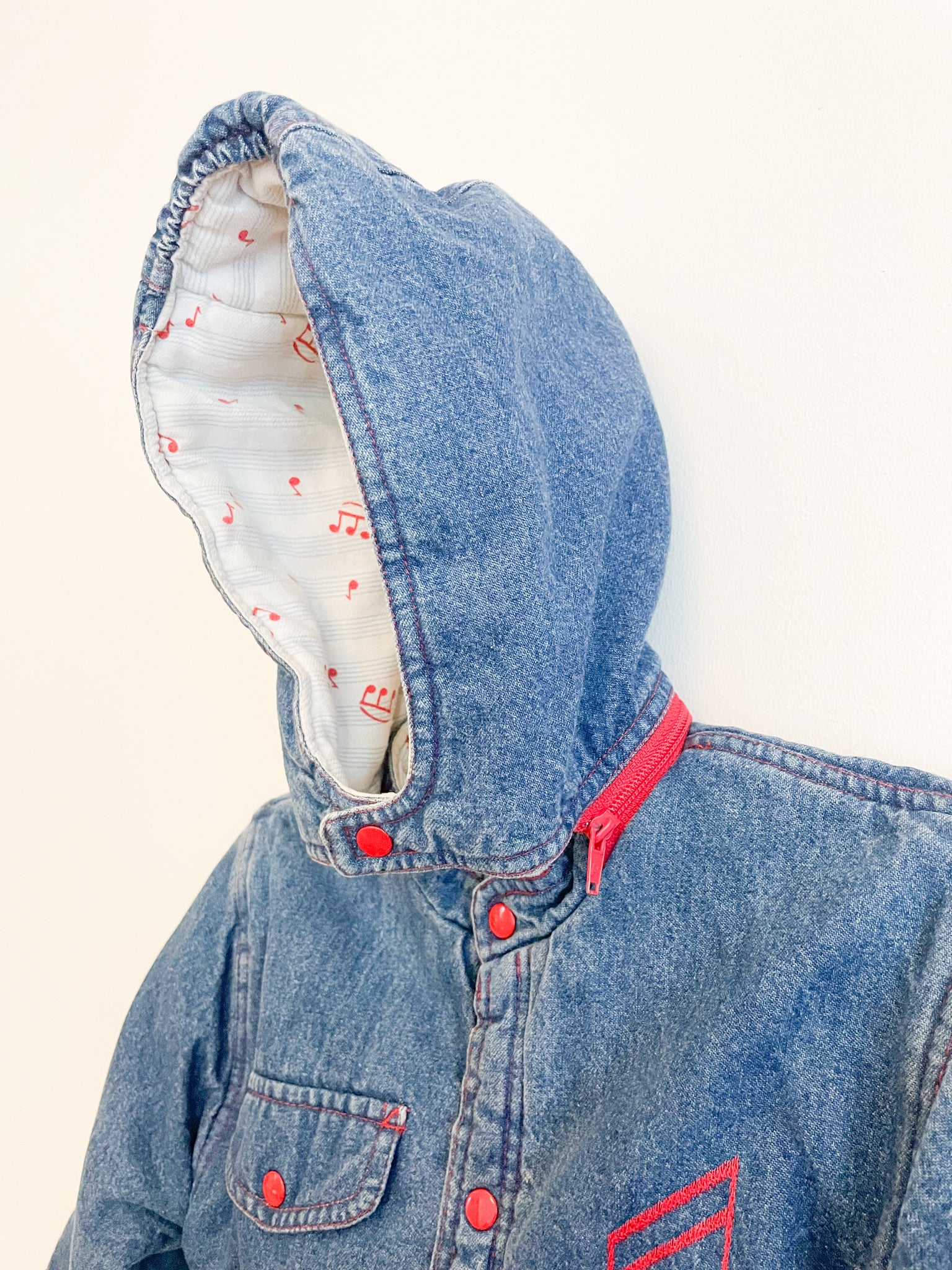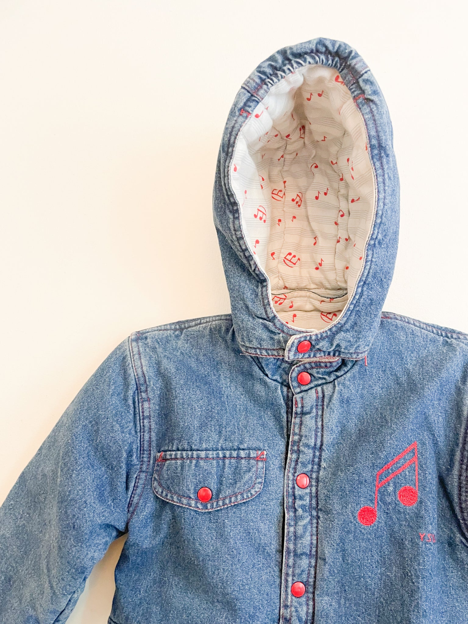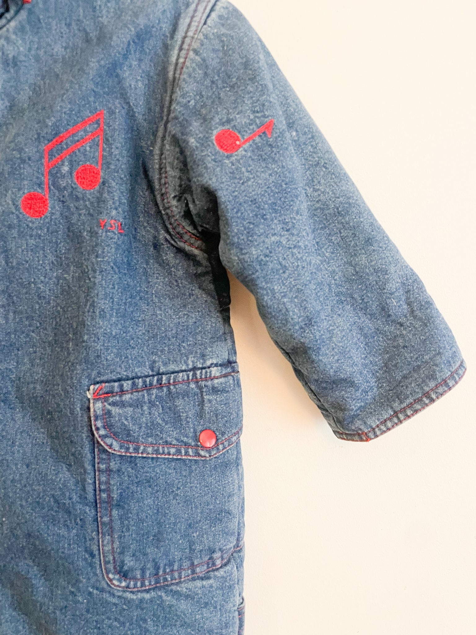 A spectacular pair of YSL enfance denim overalls with music note embroidery, fully lined in music note print thin cotton-wool blend fabric, zip closure, 3 pockets with snap button closure, snap button closure down front, and removable hood with snap button closure.