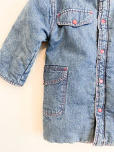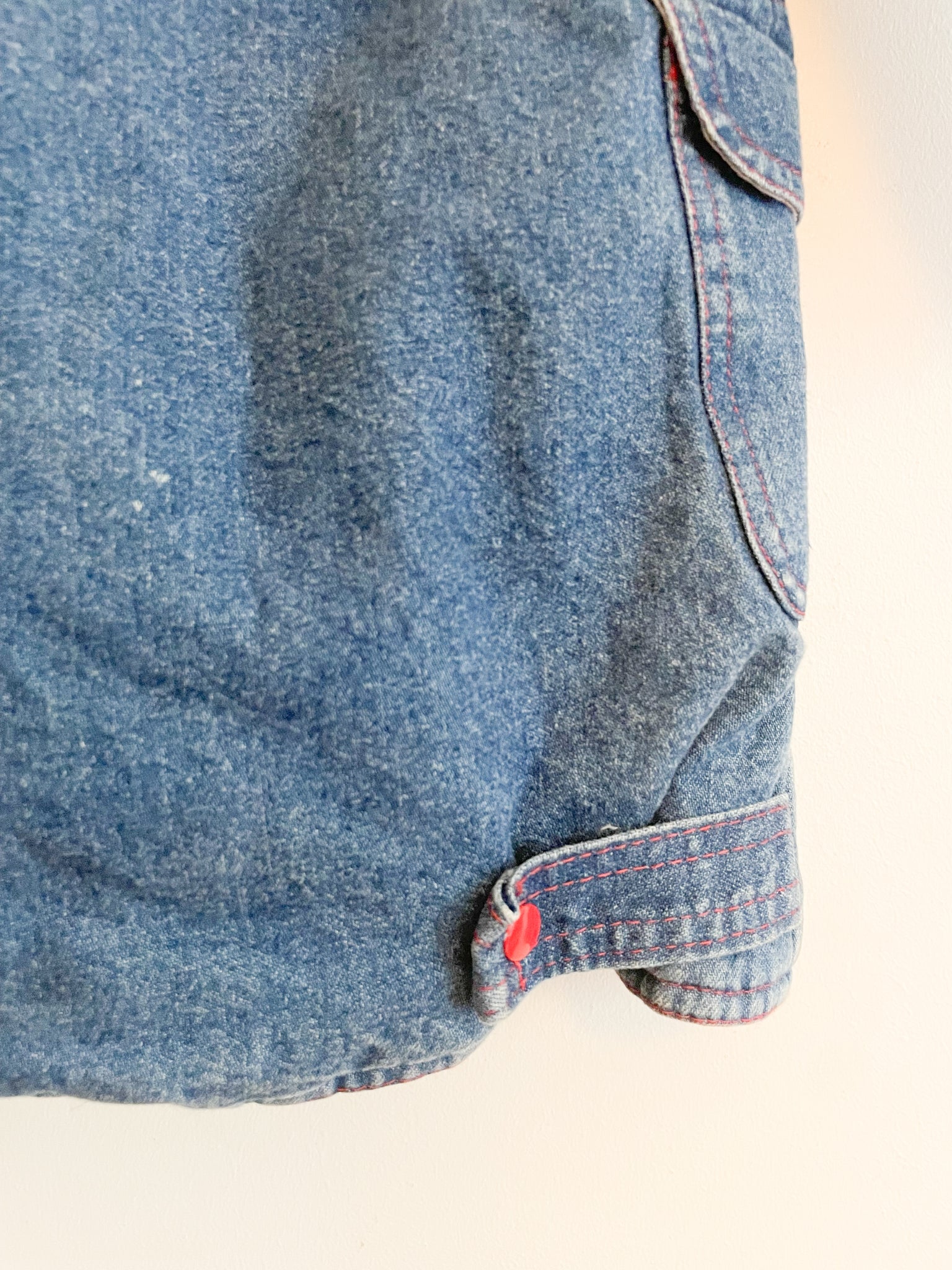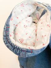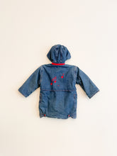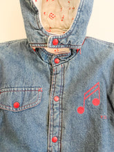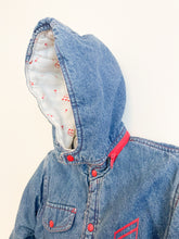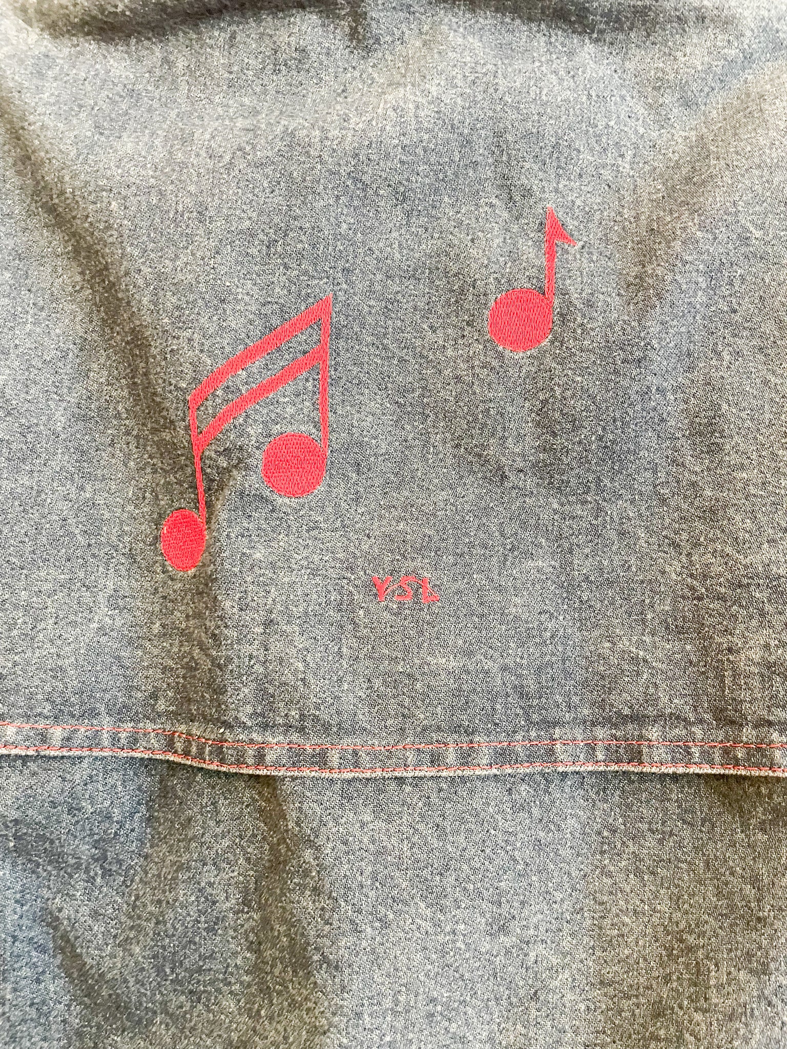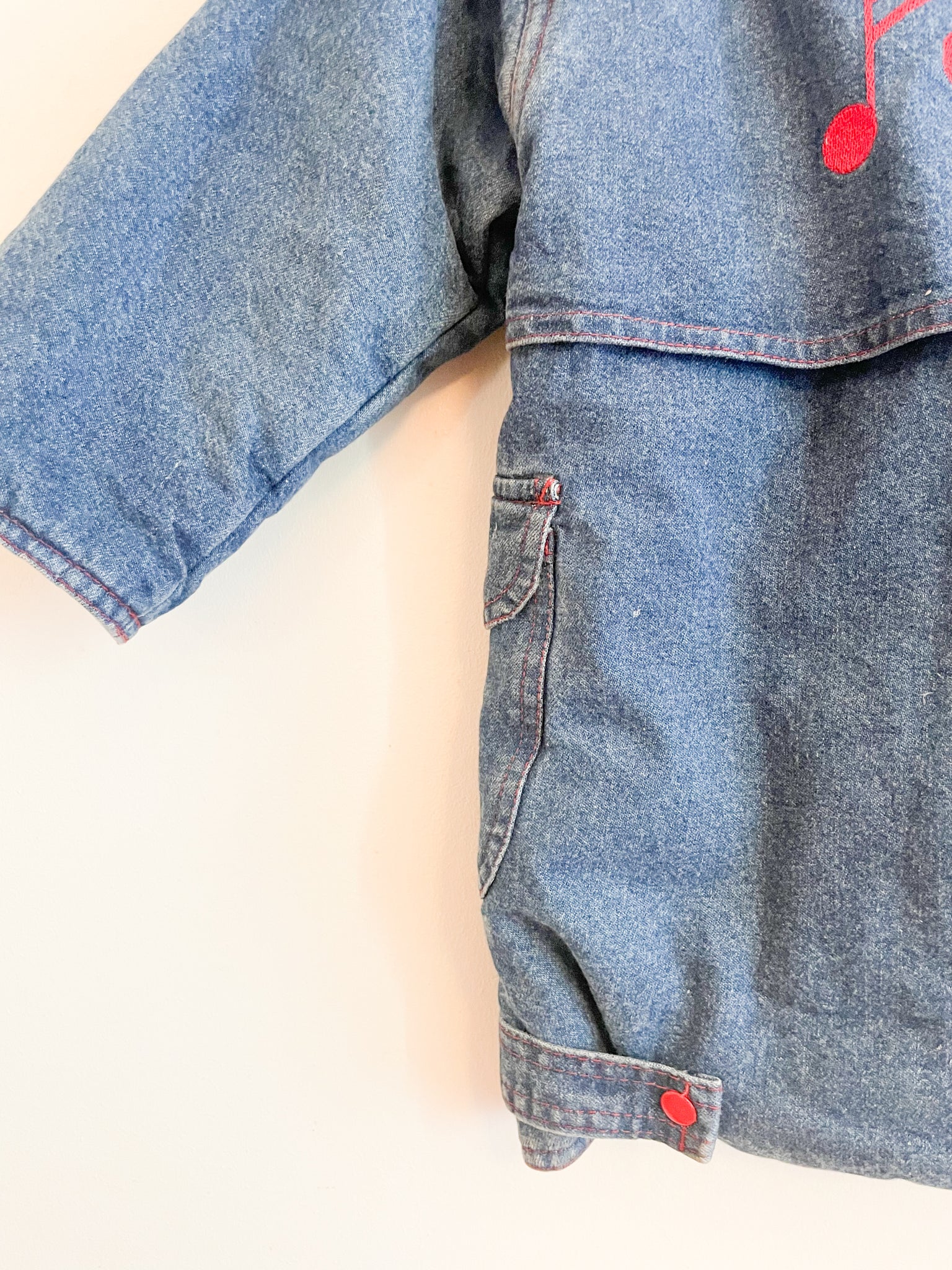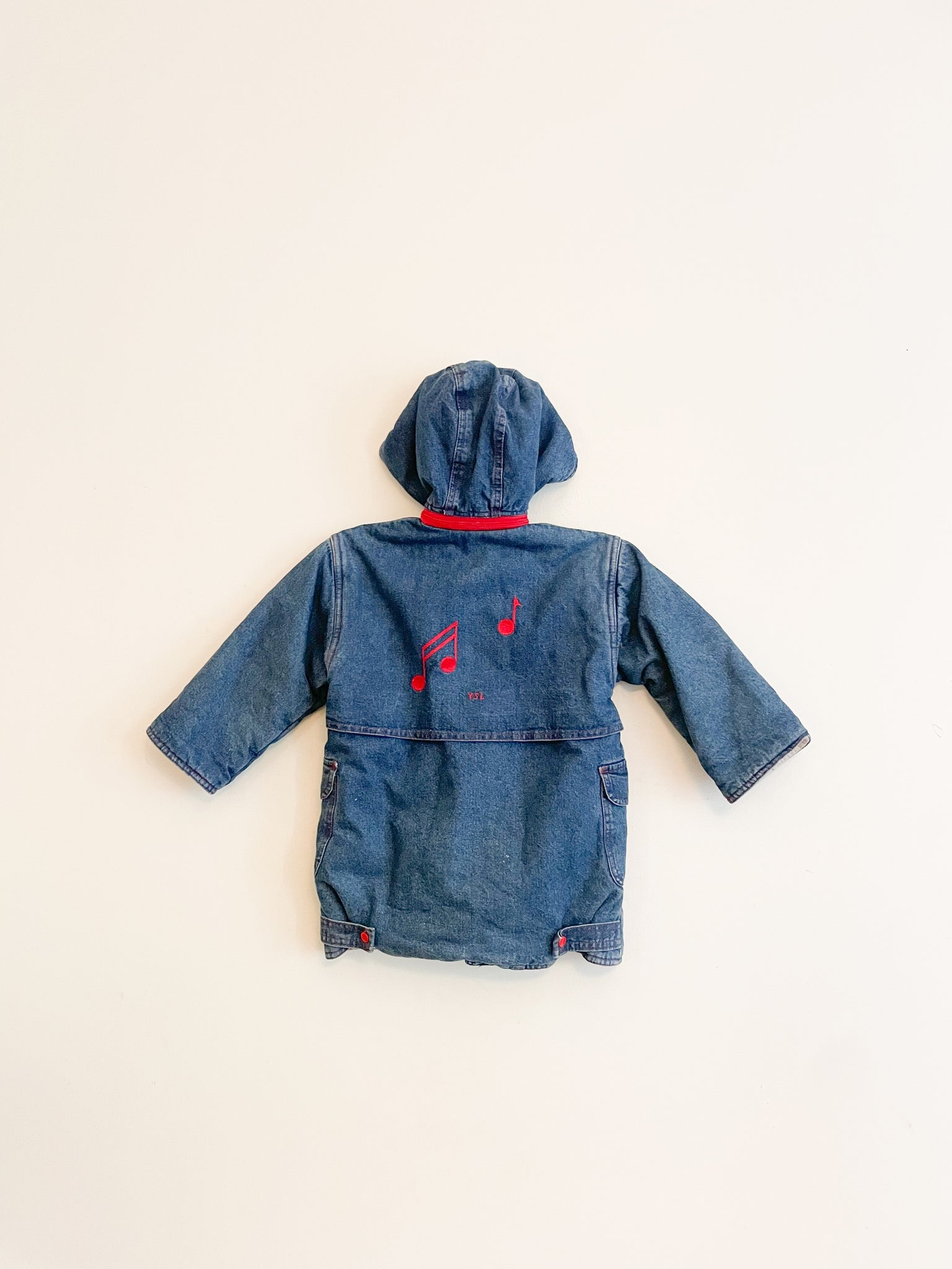 A spectacular pair of YSL enfance denim overalls with music note embroidery, fully lined in music note print thin cotton-wool blend fabric, zip closure, 3 pockets with snap button closure, snap button closure down front, and removable hood with snap button closure.