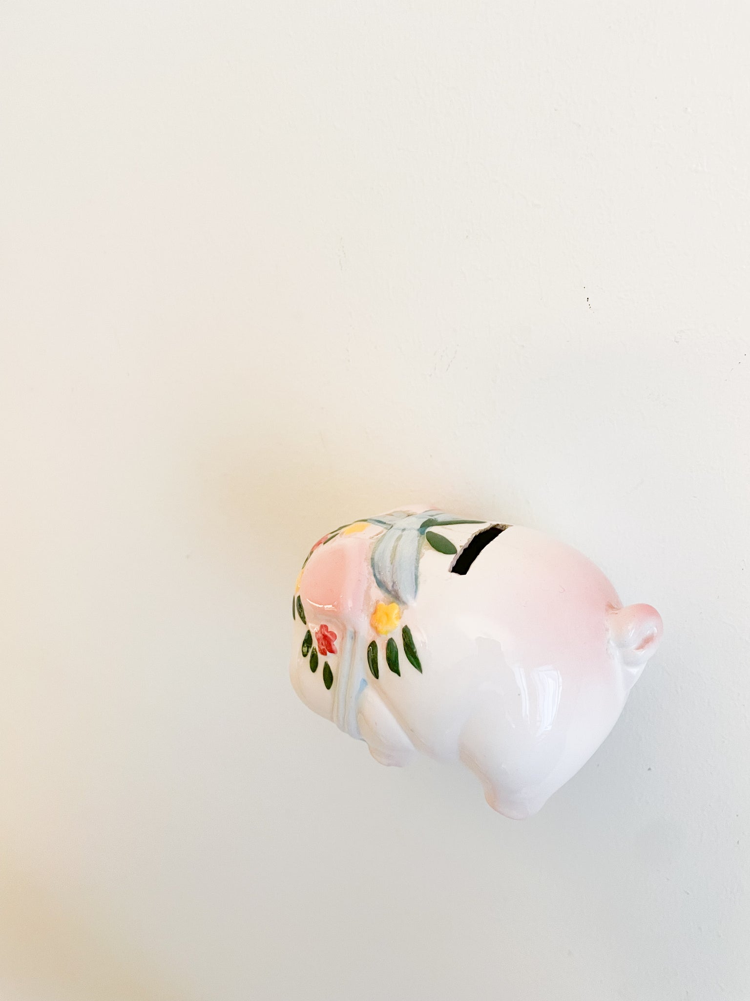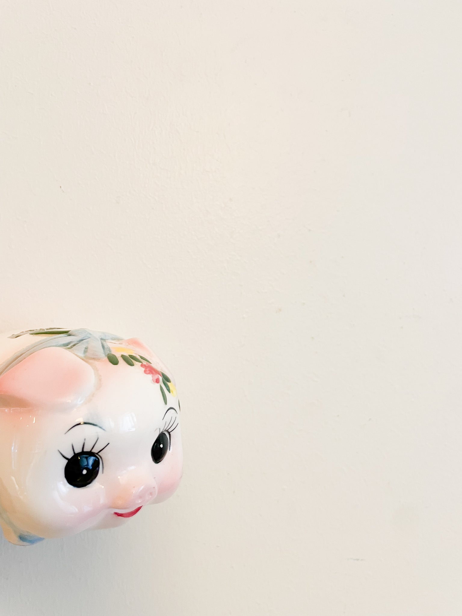 An incredibly charming and nostalgic hand-painted ceramic vintage pig piggy bank.