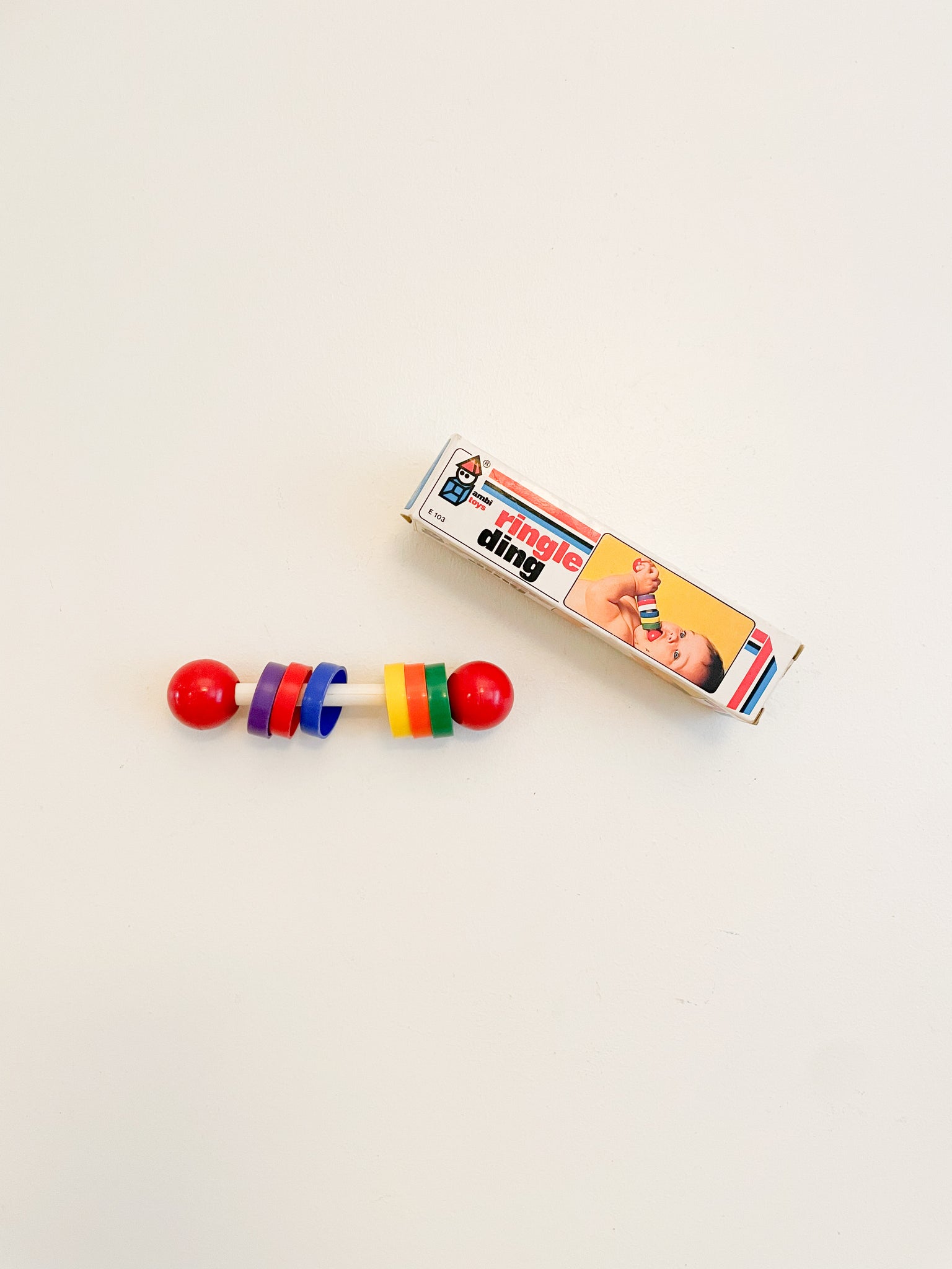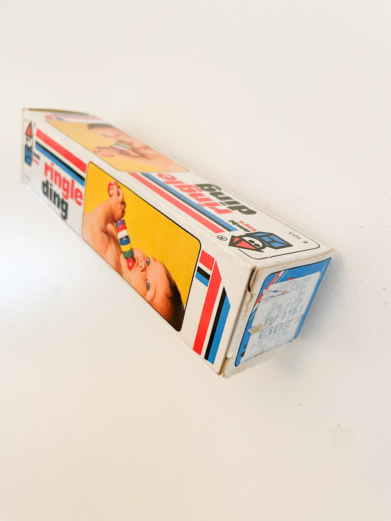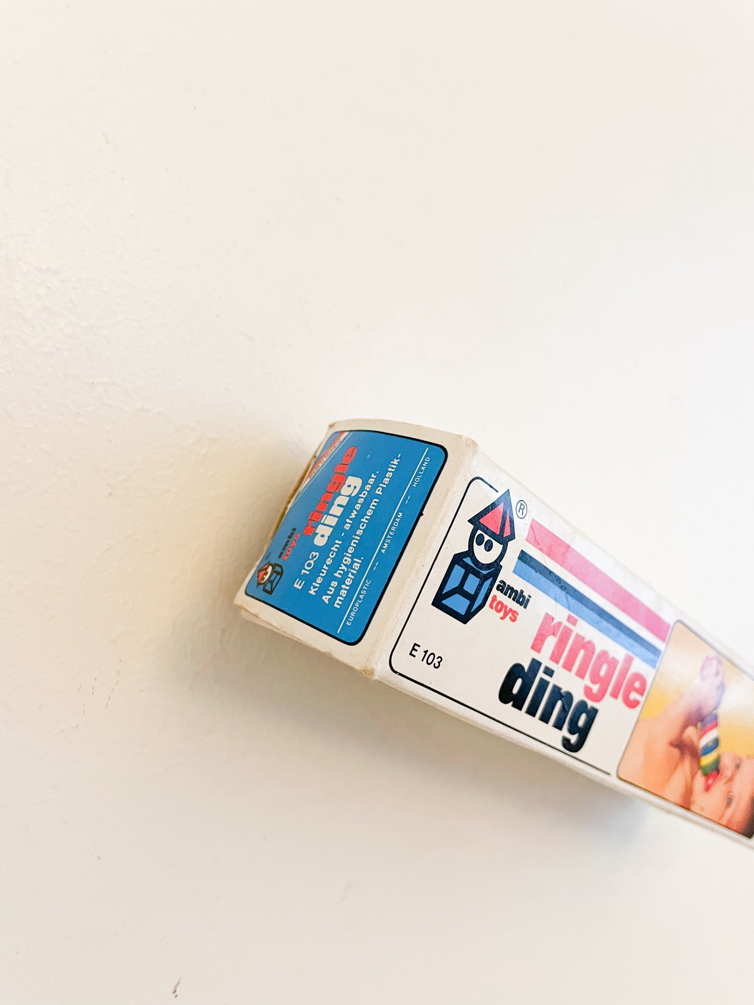A vintage Ambi Toys ringle ding plastic rattle toy in its original packaging!