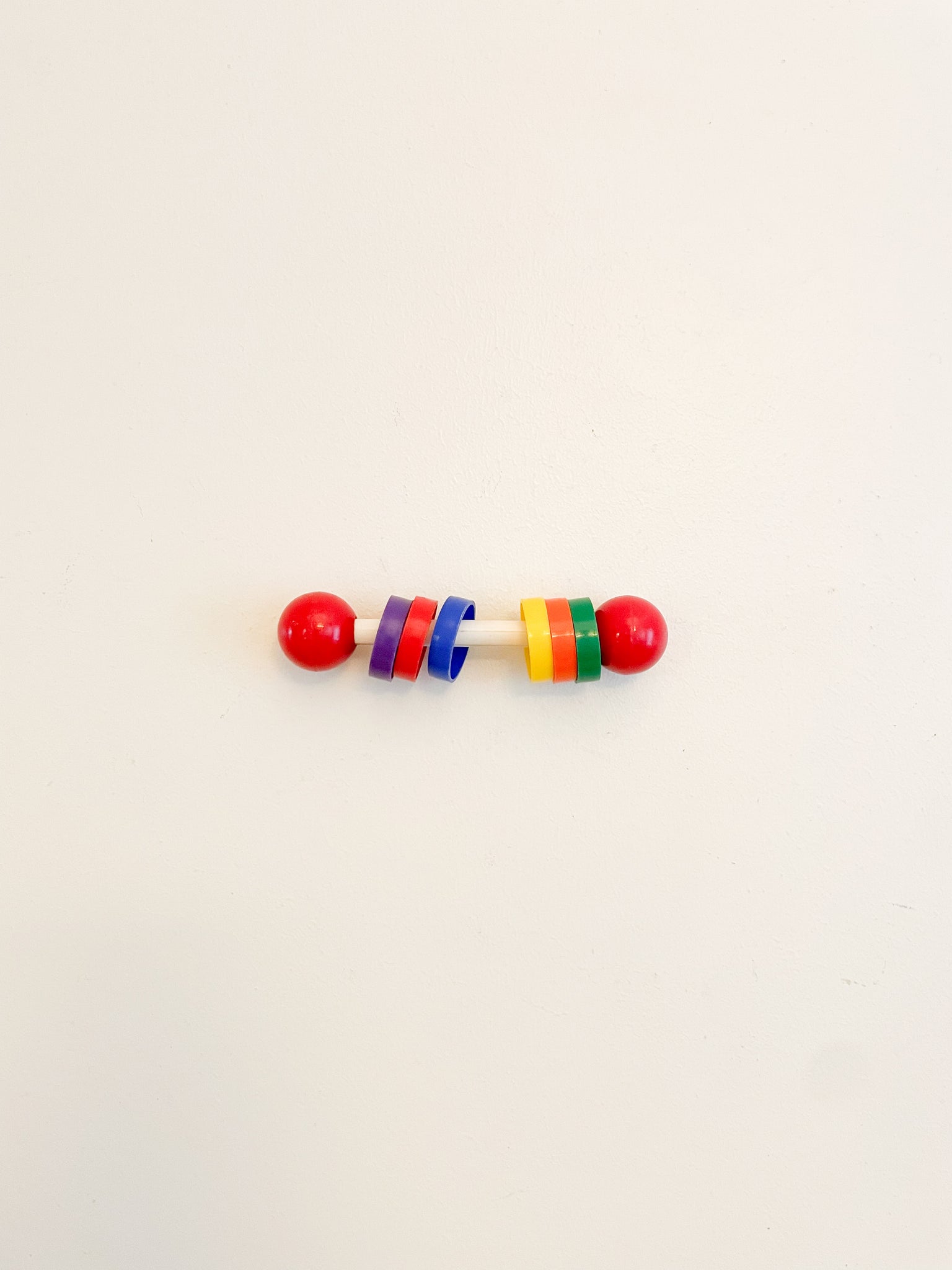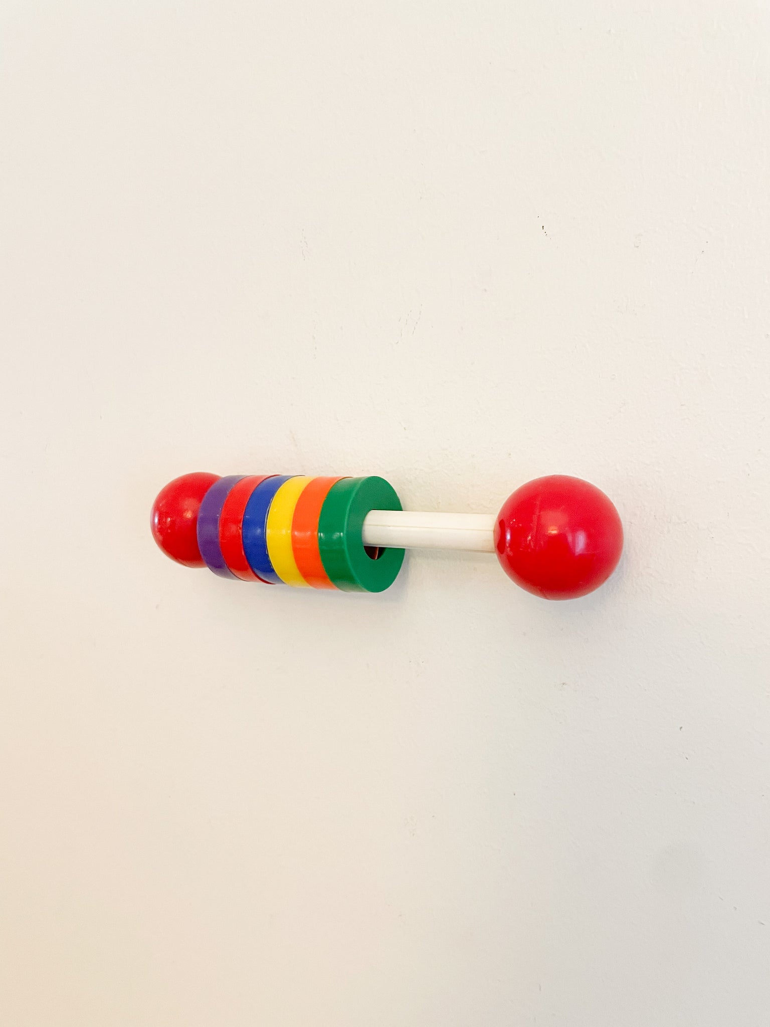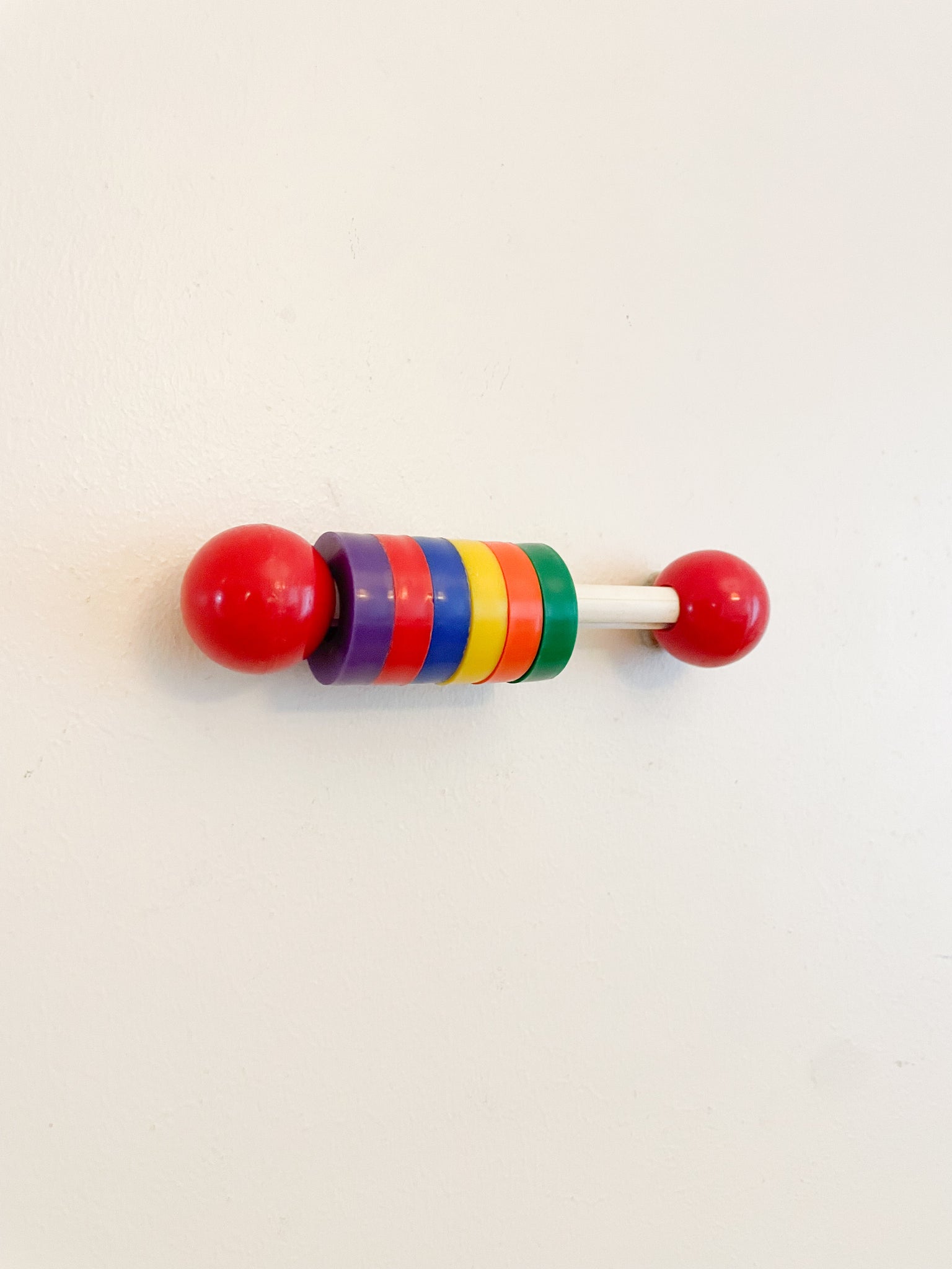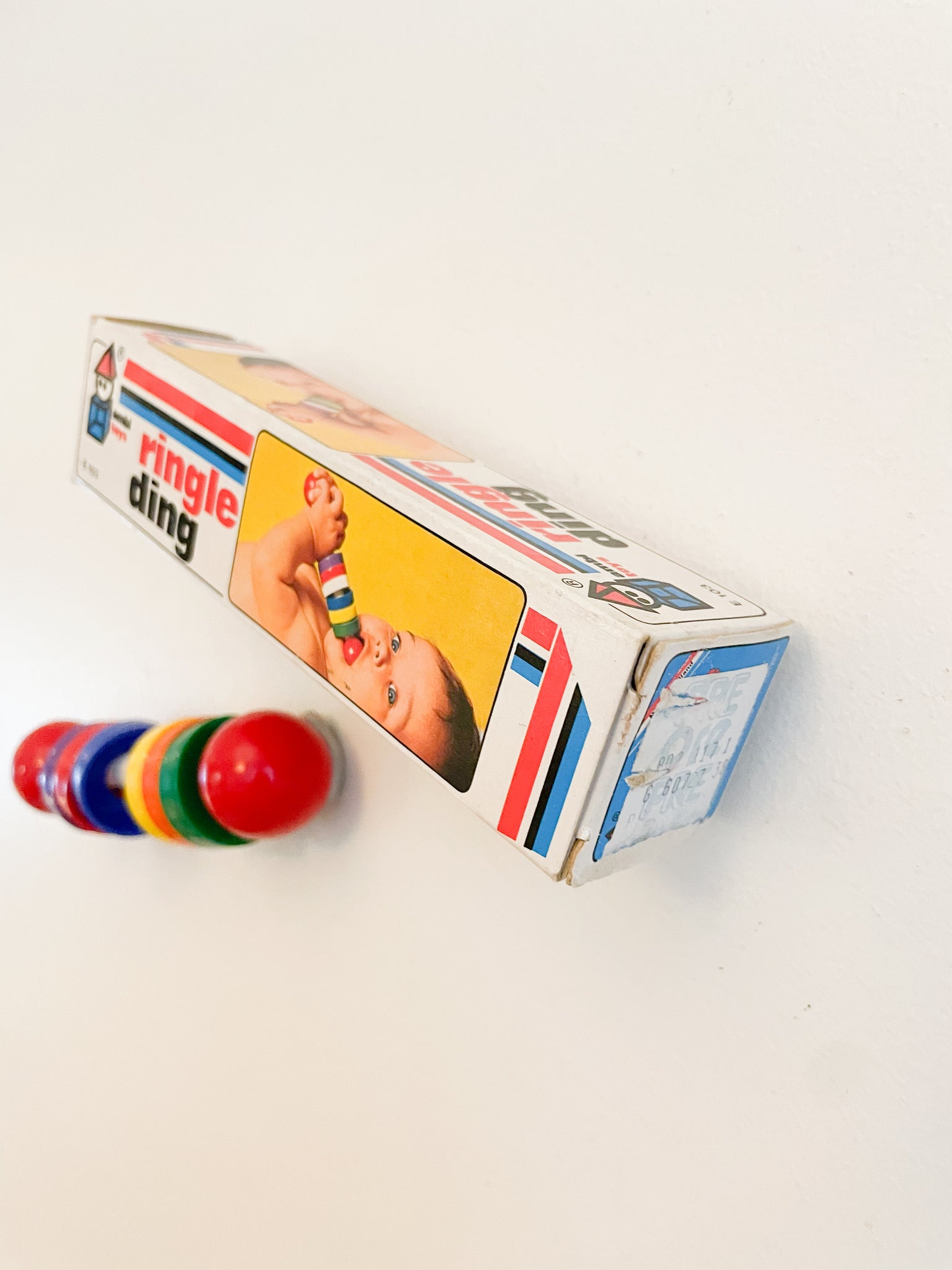 A vintage Ambi Toys ringle ding plastic rattle toy in its original packaging!