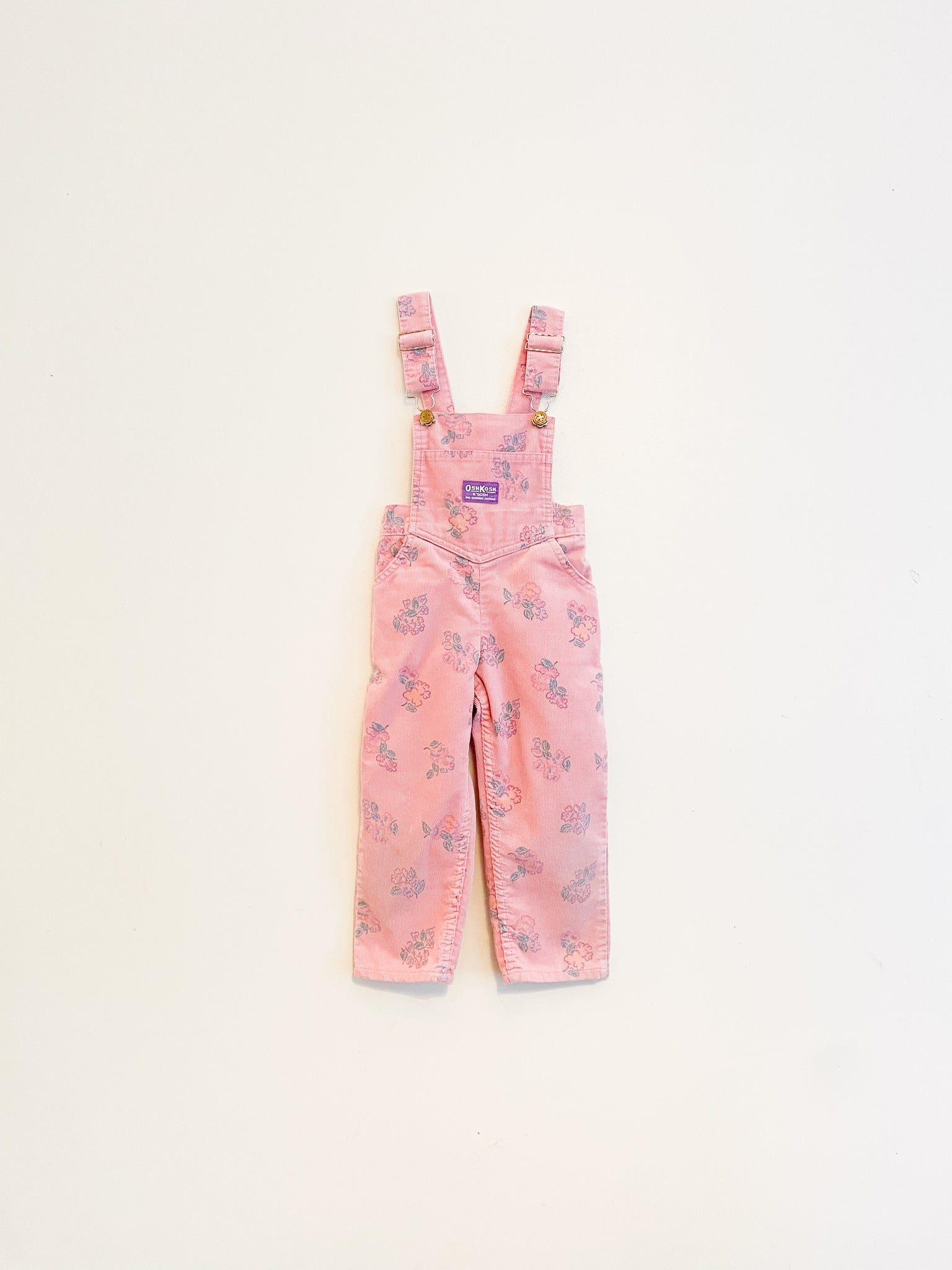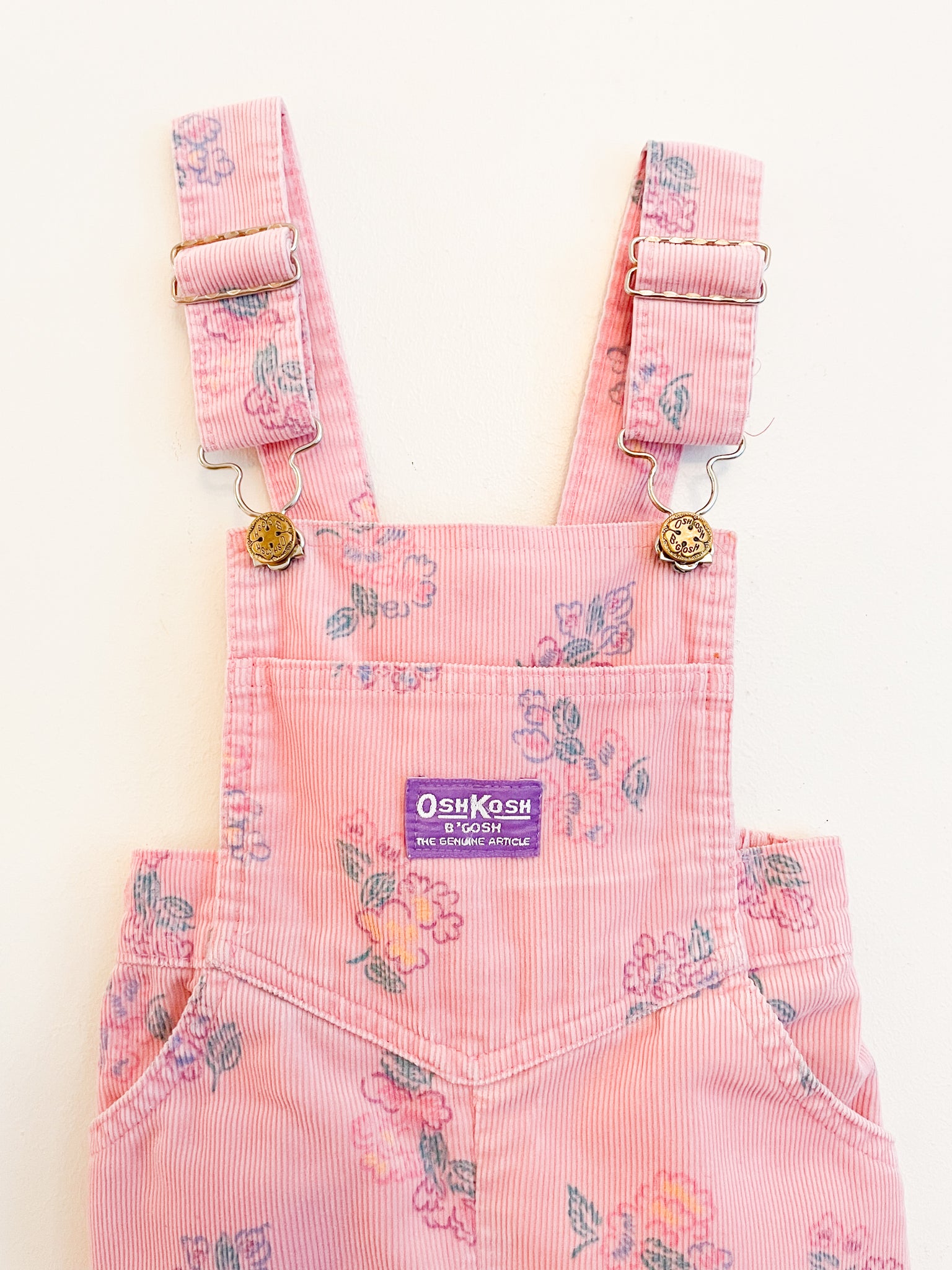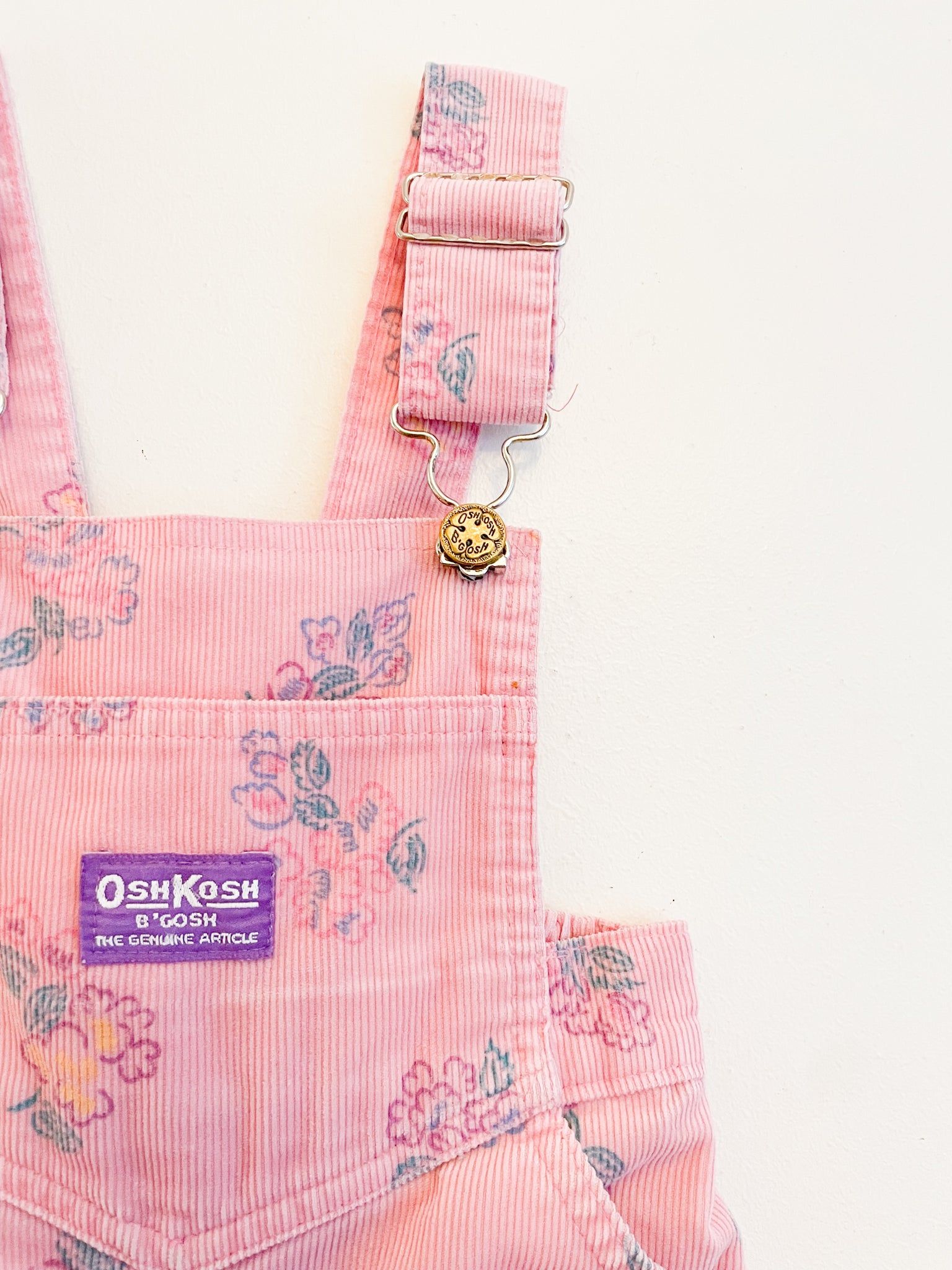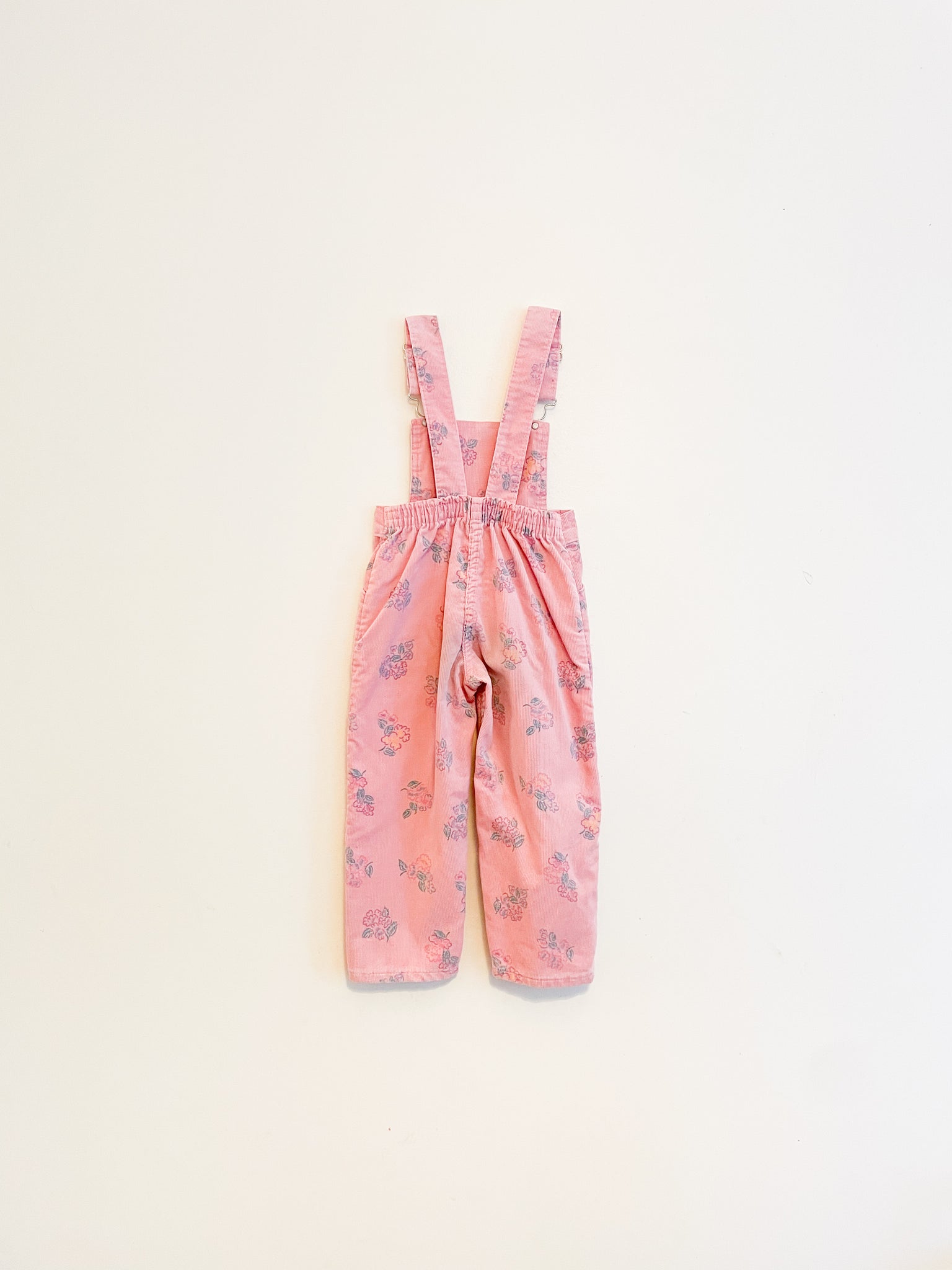 100% cotton vintage 3-pocket corduroy overalls with all-over floral print, adjustable straps and elastic at back of waist.