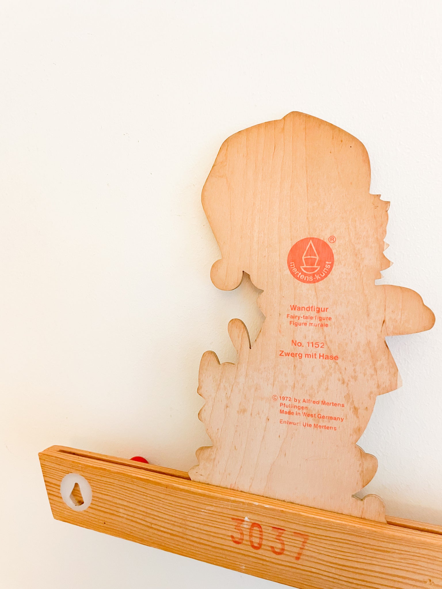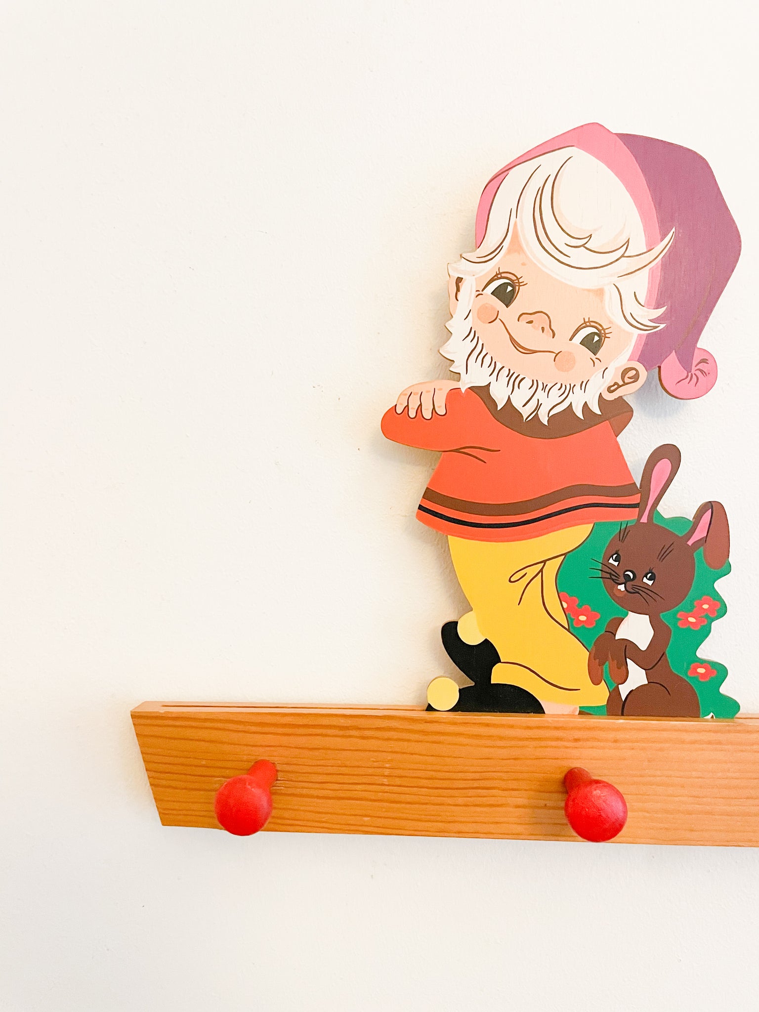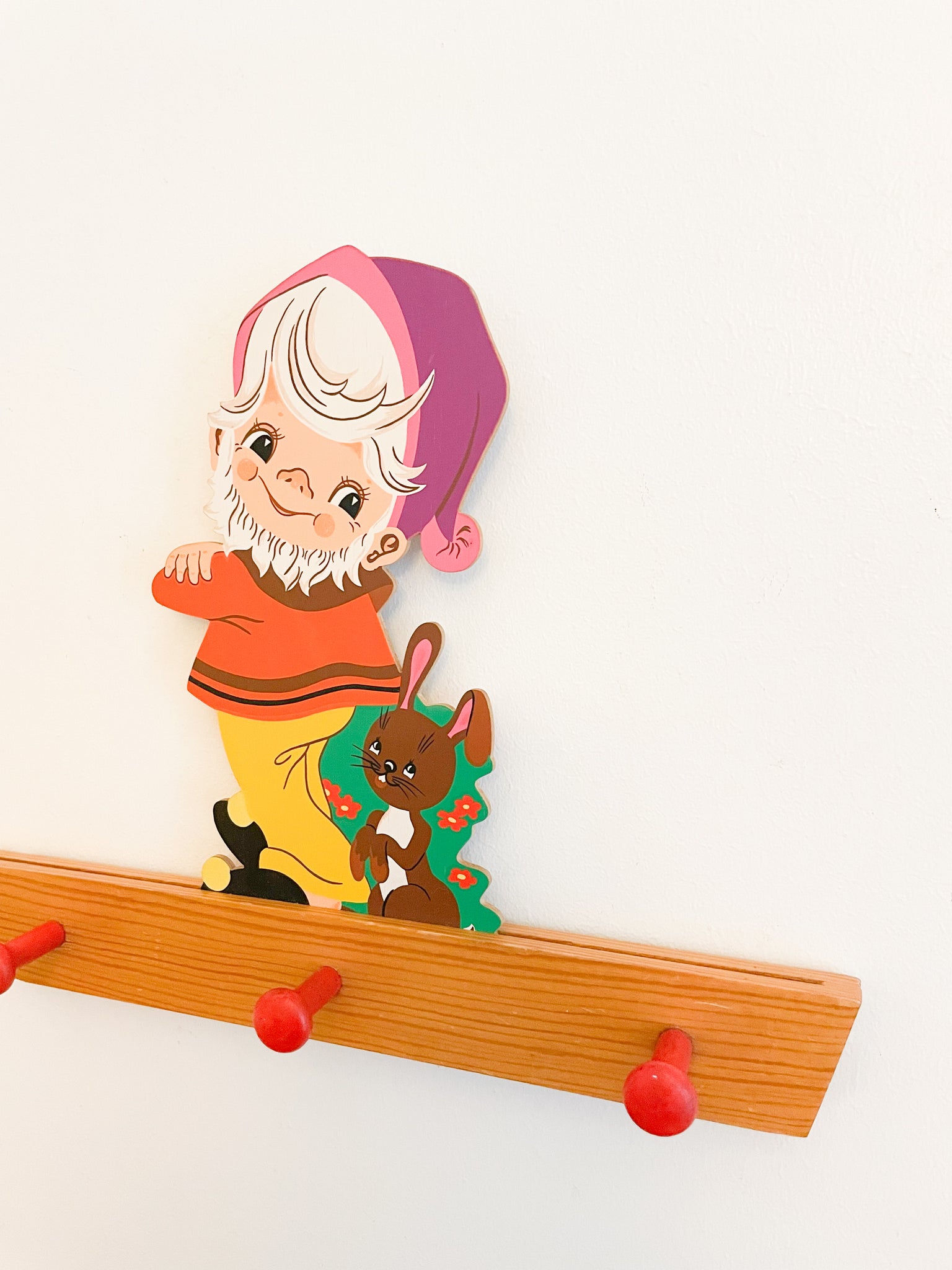 The most charming vintage wooden children's gnome-bunny 3-knob wall rack perfect for hanging the sweetest treasures.