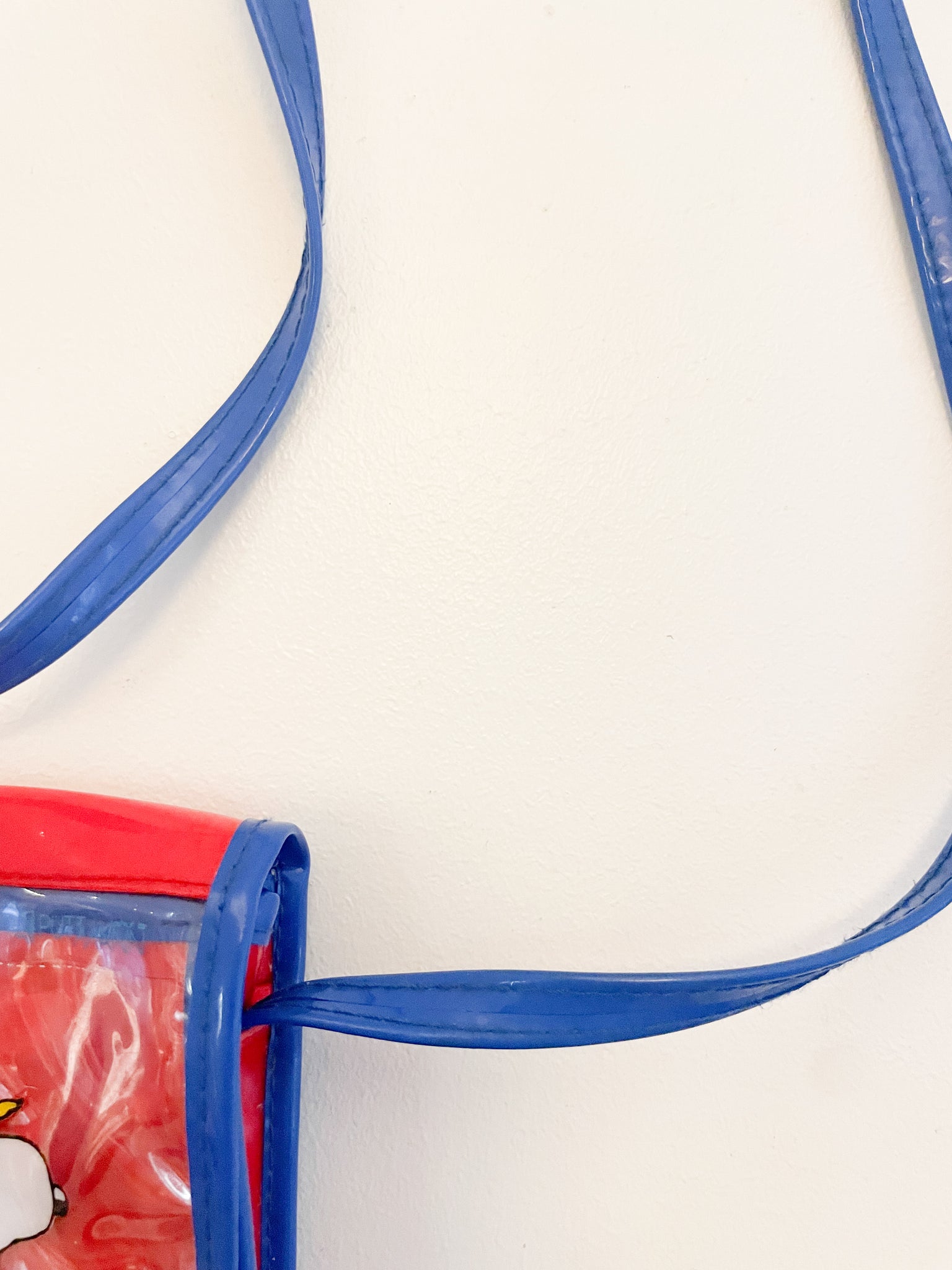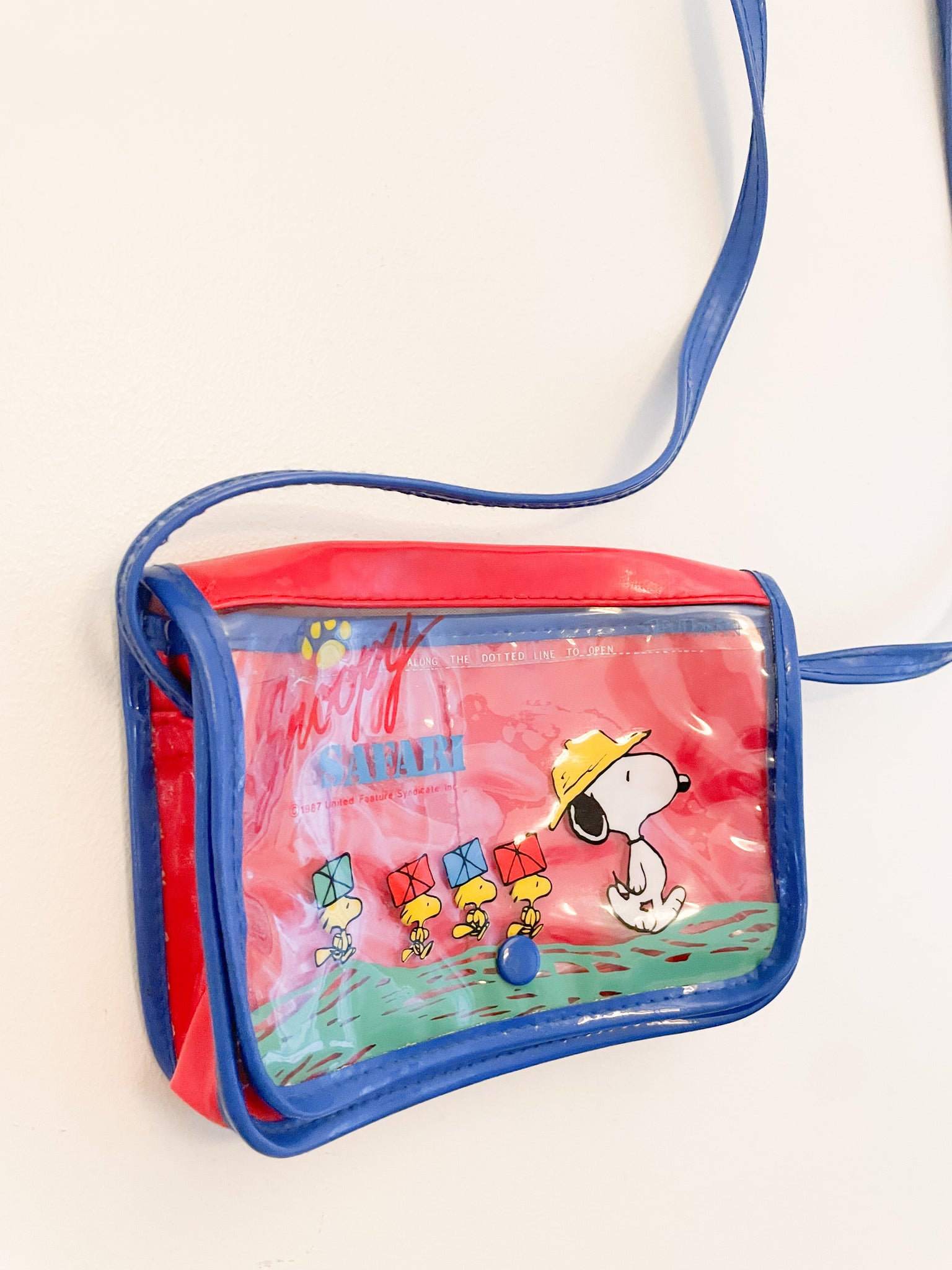 The coolest 1987 vinyl Snoopy safari bag with single snap button closure, 3 small front compartments and one large inner compartment.